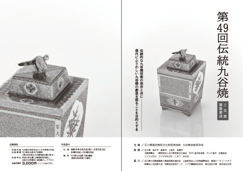 今年も石川県指定無形文化財保持団体 九谷焼技術保存会主催の「伝統九谷焼工芸展」を開催いたします。本展は伝統的な九谷焼技術の保存と共に現代にふさわしい九谷焼の創造を図ることを目的とした公募展です。